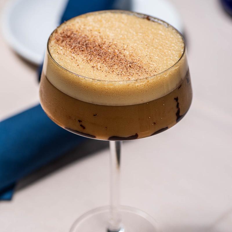Fresh-pulled Espresso, Elevate Vodka, Koval Intelligencia Coffee Liqueur, Dry Curacao, Vanilla, Cinnamon, & Nutmeg